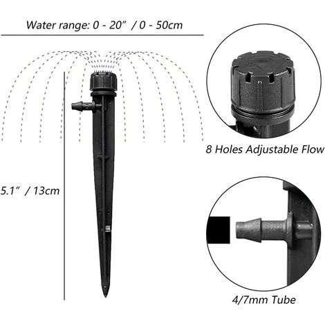 GAMME D’IRRIGATION – 8 trous de sortie en haut de chaque goutteur offrent une couverture 360 degrs avec des plages de diamtre de cercle de 0 50 cm / 0 20 pouces, les goutteurs conviennent au tube: diamtre intrieur 4 mm, diamtre extrieur 7 mm.