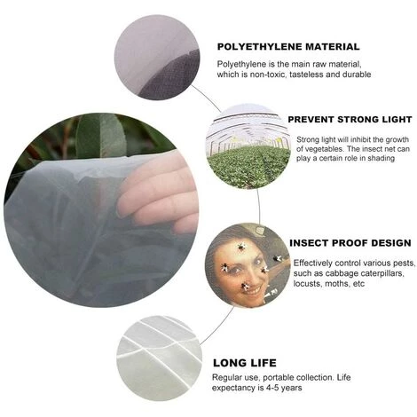 Il est fabriqué en maille transparente de qualité supérieure et en PE (polyéthylène), anti-UV très efficace, très résistant. Le filet en maille fine peut empêcher efficacement la destruction des légumes par les papillons, les teignes du poireau, les mouches de la carotte et de l’oignon, les pucerons et autres petits insectes. La maille fine n’affecte pas l’arrosage des légumes.